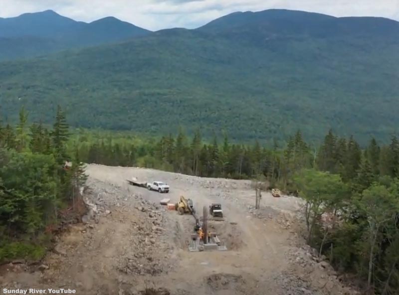 Trails were cleared this spring, including the 500 vertical foot lift line running from the junction of Ridge Run and Second Thoughts to an area east of Merrill Hill's 1,914 foot ledgy summit. Concrete has been poured for the base and summit terminals, while forms are being constructed for the tower footings.